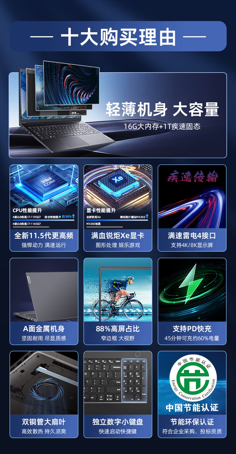聯(lián)想筆記本電腦 11.5代酷睿i7高性能輕薄本 大學(xué)生設(shè)計(jì)商用辦公大屏手提本 15.6丨i7-119 24G 1T+1T固態(tài)定制 全高清屏 銳炬Xe 雷電接口 曜夜黑 自營